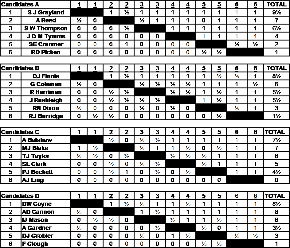 Candidates A – Winner = Stan Grayland, Candidates B – Winner = D.J. Finnie, Candidates C – Winner = Anthony Balshaw, Candidates D – Winner = David Coyne, All of whom have qualified for the 2011/12 Championship Final. For full results click here:-Candidates Results