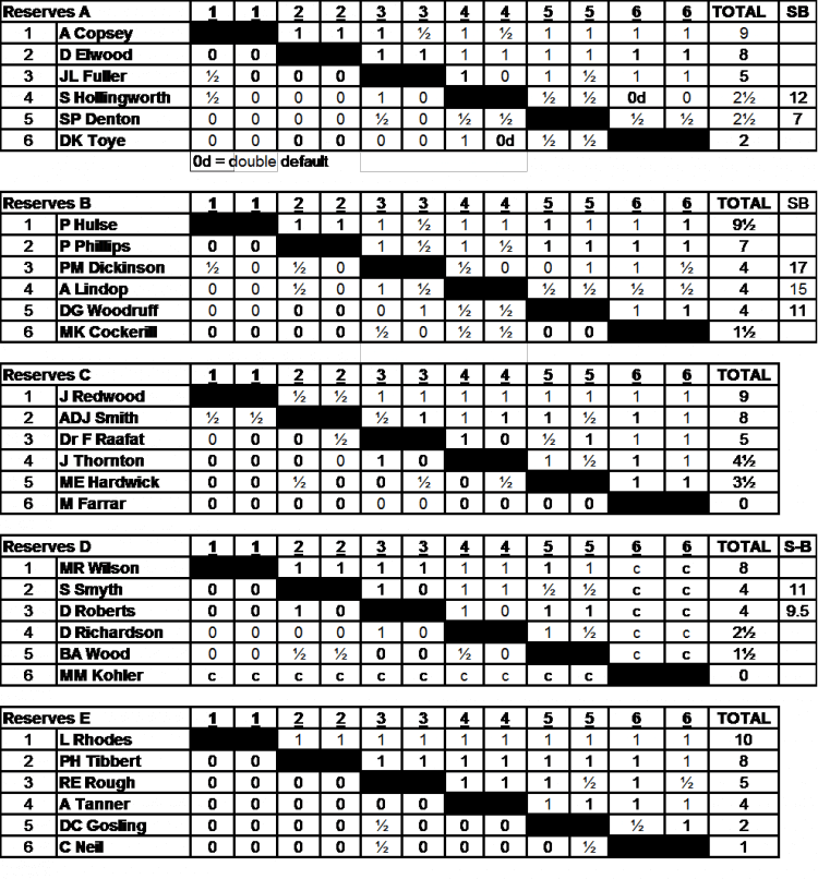 Reserves A – Winner = A. Copsey, Reserves B – Winner = Peter Hulse, Reserves C – Winner = J. Redwood, Reserves D – Winner M.R. Wilson, Reserves E – Winner L Rhodes, These players have qualified for the 2011/12 Candidates Tournament. For full results click here:-Reserves Results