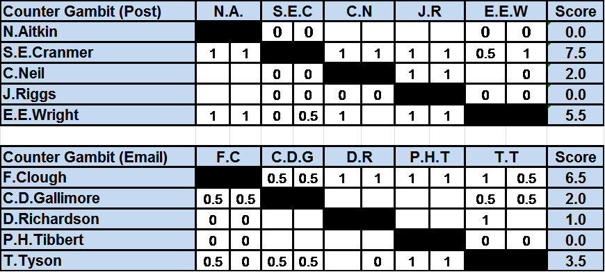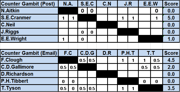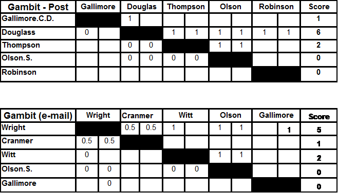 Fred Clough has updated the results for the Gambit and Counter Gambit Tournament.