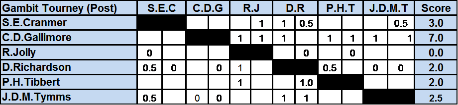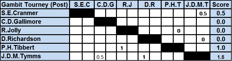 The Gambit Tournament and Counter Gambit Tournament A have been won by Derek Gallimore and the Counter Gambit Tournament B by Neil Limbert – Well Played Both! For full details see the the Tournament Results Page