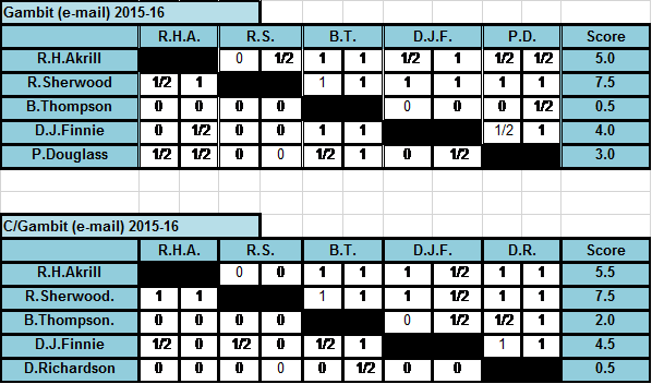 The ‘Postal’ Gambit Tournament was won by Derek Gallimore with 4 points – well played Derek. This was the last postal event and Gambits will be email only for 2016/17